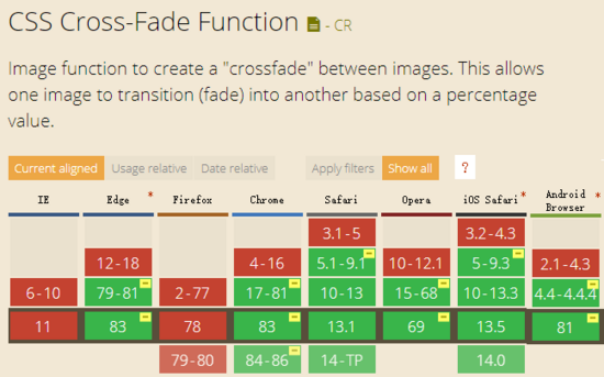 另外, cross-fade() 函数加入CSS规范后有了新的语法,更灵活更强大,但是目前没有任何浏览器支持,因此本文没有做相关介绍。