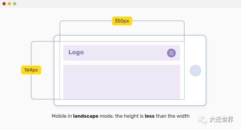 我们有一个横屏手机,其中有一个元素具有vmin单元。在这种情况下,值将根据视口高度计算,因为它小于宽度。