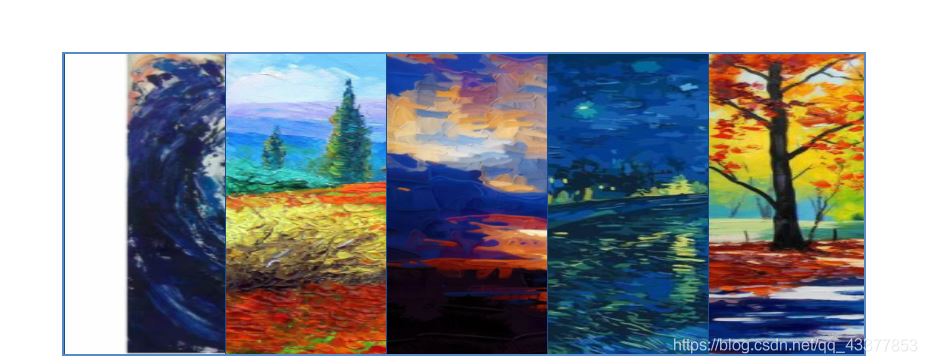 主要思路:其实这个百叶窗还是利用了一种障眼法,我们看上去是鼠标移动上去之后,图片展开了,其实这些图片在原地根本没有动,只不过是我们把这些图片放在了一个列表里,相互叠加,鼠标移动的同时改变列表的宽度。