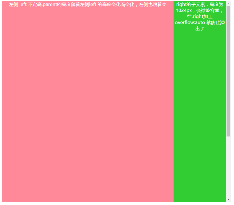 <div class="right"> <div class="right-inner">right的子元素,高度为1024px,会撑破容器,给.right加上 overflow:auto 就防止溢出了</div> </div>