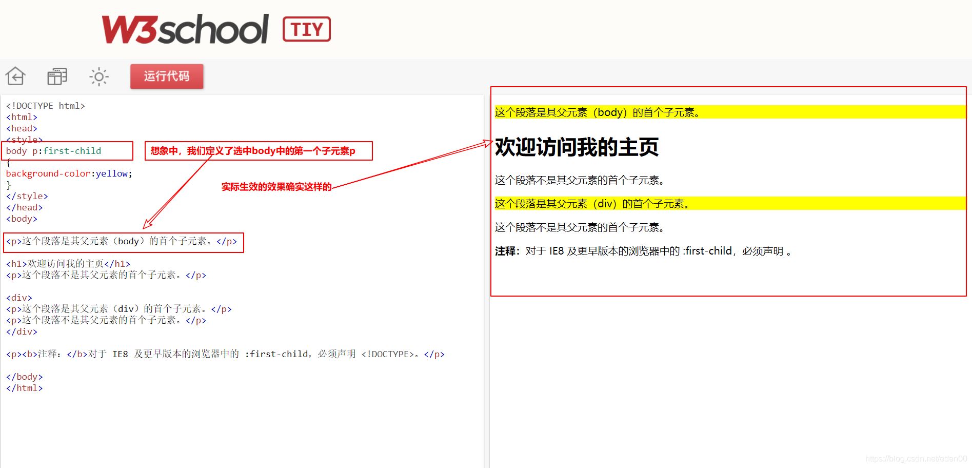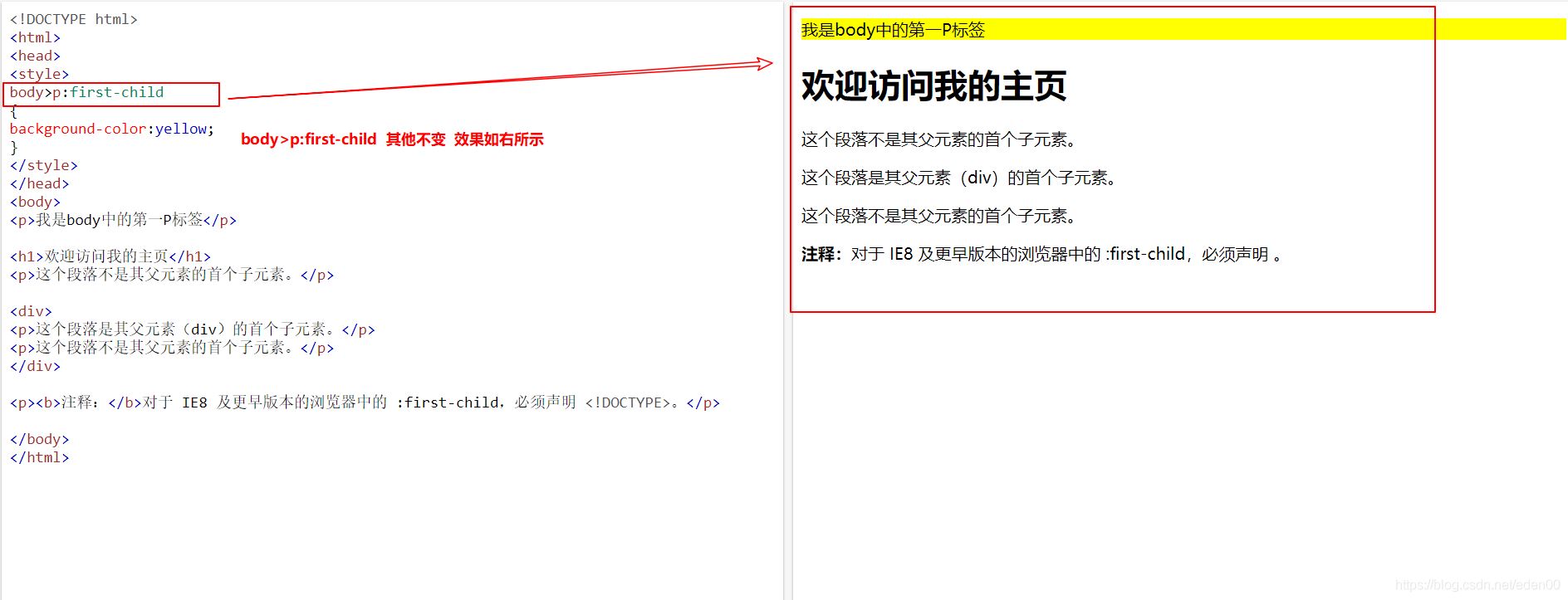 <p><b>注释:</b>对于 IE8 及更早版本的浏览器中的 :first-child,必须声明 <!DOCTYPE>。</p>