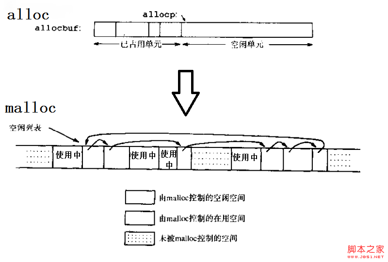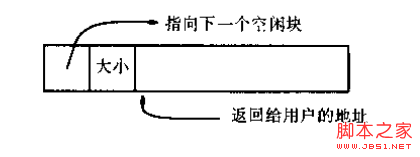 仅仅依靠地址运算来进行定位,是限制分配回收灵活性的原因,它要求已使用部分和未使用部分必须通过某个地址分开成两个相邻区域。为了能让这两个区域能够互相交错,甚至其中还包括一些没有分配的地址空间,需要使用指针把同类的内存空间连接起来形成链表,这样就可以处理地址不连续的一系列内存空间。但是为什么只连接了空闲空间而不连接使用中的空间?这么问可能出于在对图中二者类比时的直觉而没有经过思考,这很简单,因为没有必要。前者相互链接是为了能够在内存分配时遍历所有空闲空间,并且在使用free()回收已使用空间时进行重新插入。而对于使用中的空间,由于我们在分配空间时已经知道它们的地址了,回收时可以直接告诉free(),并不用像malloc()时进行遍历。
