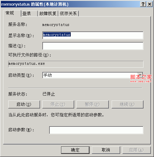 MemoryStatus 的启动类型是手动,也就是说根据需要来启动这个服务。右键单击该服务,然后选择上下文菜单中的“属性”菜单项,此时显示该服务的属性窗口。在这里可以修改启动类型以及其它设置。你还可以从“常规”标签中启动/停止服务。