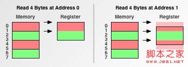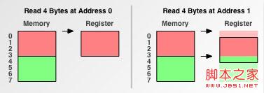 为了说明内存对齐背后的原理,我们考察一个任务,并观察内存存取粒度是如何对该任务产生影响的.这个任务很简单:先从地址0读取4个字节到寄存器,然后从地址1读取4个字节到寄存器.