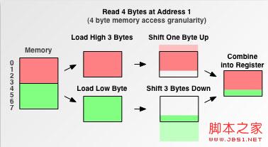 处理器对非对齐内存的存取有一些技巧.考虑上面的四字节存取粒度处理器从地址1读取4字节的情况,你肯定想到了下面的解决方法: