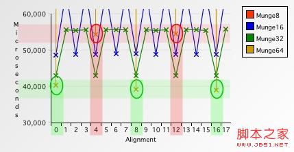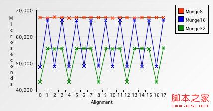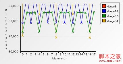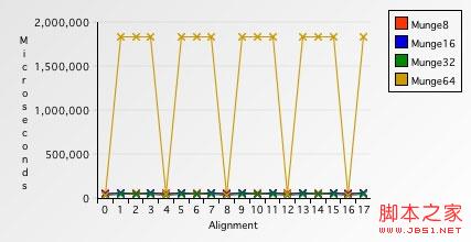 Munge64处理对齐的缓冲区需要39085微秒--大约比对齐的Munge32快10%.但是,在非对齐缓冲区上的处理时间是让人惊讶的1841155微秒--比对齐的慢了两个数量级,慢了足足4610%.