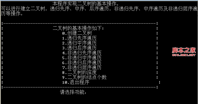 先使用先序的方法建立一棵二叉树,然后分别使用递归与非递归的方法实现前序、中序、后序遍历二叉树,并使用了两种方法来进行层次遍历二叉树,一种方法就是使用STL中的queue,另外一种方法就是定义了一个数组队列,分别使用了front和rear两个数组的下标来表示入队与出队,还有两个操作就是求二叉树的深度、结点数。。。