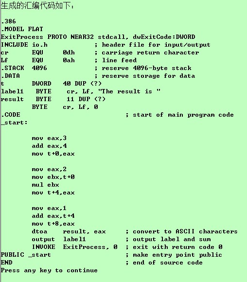 puts("生成的汇编代码如下:\n");