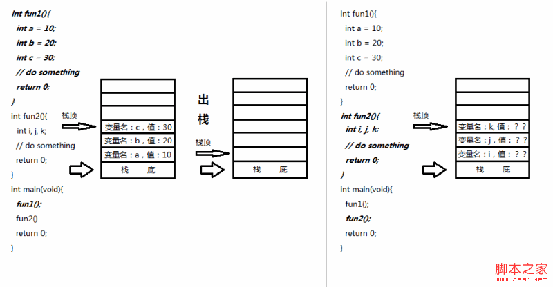 PS:有的编译器为了提高效率,在出栈时不会进行数据清空,这也就意味着,下个函数里的变量在入栈使用该空间时,里面的数据是上一次变量操作的结果。