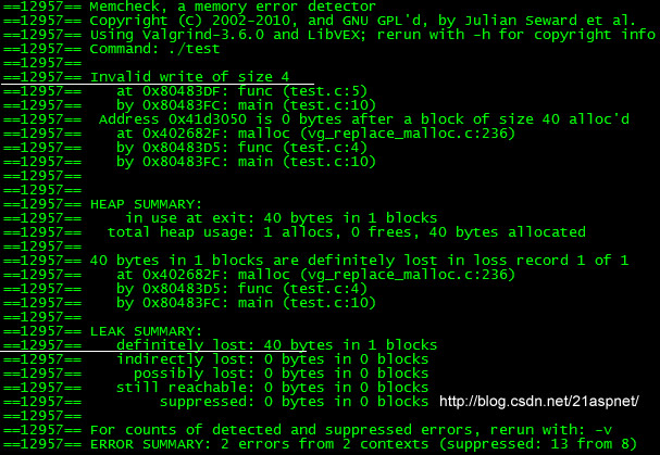 40 bytes in 1 blocks:表示因程序退出而发生内存泄露40字节