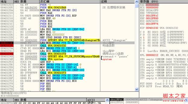 通过这个过程可以发现很多C++的知识。如:对象的空间是在调用构造函数之前就分配好了的;对象里边没有函数;this指针通过寄存器ECX传递;通过声明定义的对象它的空间分配在栈中;等等这些跟系统或者C++有关联的知识。