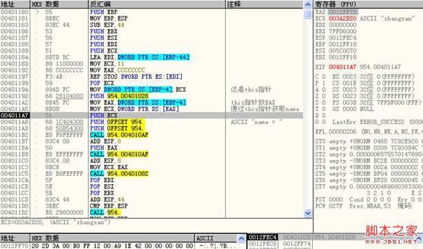 C++的同一个类定义出来的多个对象,从汇编指令看来是这样的:有很多块地址空间,它们有相同的大小。当不同的对象调用成员函数时,在汇编指令看来是:它们都call同一个地址,这个call指令其实里边是一个jmp指令,用于跳向某个位置,在call指令之前一般都会把一个地址放到ECX中,当然有时候会用堆栈或者其它寄存器。