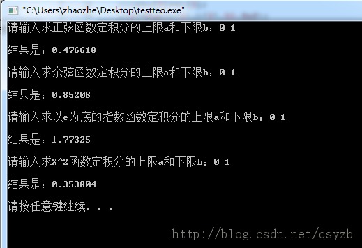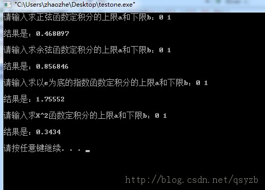 cout<<"\n请输入求余弦函数定积分的上限a和下限b:";