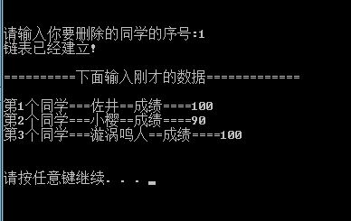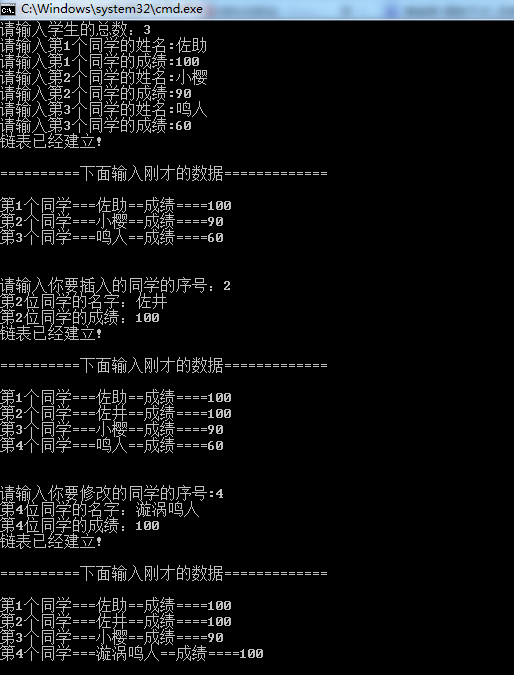 在程序1.1中,我们已经建立了一个链表。然后,我们在小樱和鸣人之间插入一个佐井同学的成绩