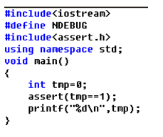 解释:因为tmp=0,tmp==1为false,故程序运行的时候传给assert宏的参数为false,因此调用的结果是先向stderr打印一条出错信息,然后通过调用 abort 来终止程序运行。如果改成tmp=1,则程序完全正常运行。 如里在程序中想关闭assert宏断言,可以如下defnie NDEBUG