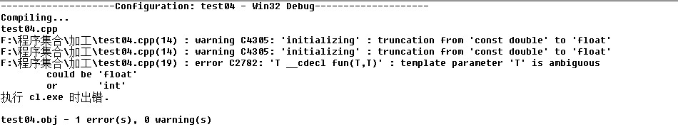 可以看到编译编译出现问题的是fun(x1,y2),说的意思就是没有对应的函数,要么x1和y2都是int型,要么x1和y2都是float型。那么我为什么要说一下这样一种情况呢?主要是为了引出模板也可以同时使用两个: