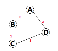 图中红色的数字代表边的权重。如果我们在最内层检查所有节点X,那么对于A->B,我们只能发现一条路径,就是A->B,路径距离为9。而这显然是不正确的,真实的最短路径是A->D->C->B,路径距离为6。造成错误的原因就是我们把检查所有节点X放在最内层,造成过早的把A到B的最短路径确定下来了,当确定A->B的最短路径时Dis(AC)尚未被计算。所以,我们需要改写循环顺序,如下:
