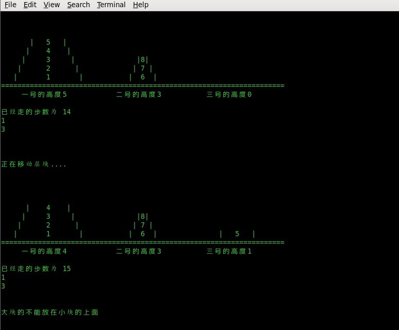 操作就是:A B 号码A的塔顶一层放在号码B的塔顶。如1(空格) 3 回车。 话说有人能把我这C的代码添加到QT界面框架上去么? 代码写的不好 ,维护性不够,只能玩8层的,写完以后发现很难拓展,软件工程,设计模式有待提高....