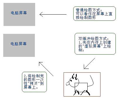 双缓冲的原理是:在内存中先把第一张图画好,此时不要转画到屏幕上,然后继续在原来的内存中画第二张,等把所有的图全画好后,再一次性贴到屏幕上。那样内存中存在的就是完整的图形,观众看不到绘图的过程,只能看到绘图的结果,而最后是一次性复制到屏幕上的,当然不会发生闪烁现象。