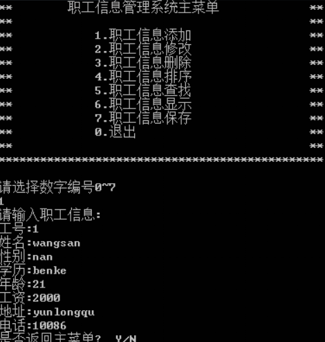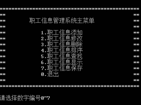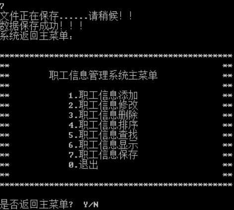 回到程序运行主界面,选择7,对职工信息的操作进行保存,同时返回到系统主界面,如图8。
