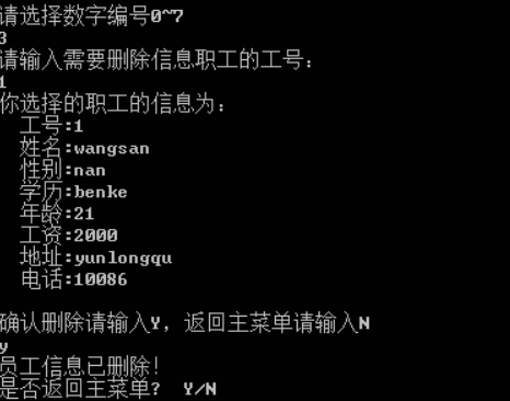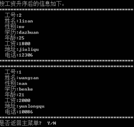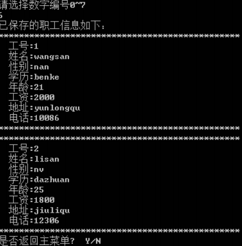 选择Y,回到程序运行主界面,继续选择6,则显示次级菜单,进入职工信息浏览显示界面如图3所示。