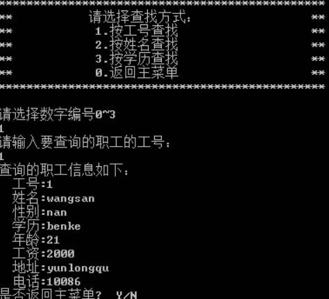 对职工信息进行查找,选择5,可以通过工号、姓名、学历三个方式进行查找,选择1确定按工号进行查找,如图4所示。
