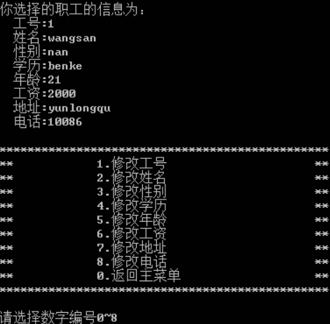 回到程序运行主界面,选择2,对职工1信息进行修改,选择次级菜单其中1~8的选项进行修改,如图6。