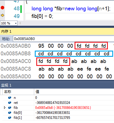 fib指向的内存初始化完成后,其的内存情况如上图,我们可以观察到这块内存的前后都有 fd fd fd fd ,0xFD为初始化受保护的内存(debug版在动态分配内存的前后加入保护内存以防止越界访问),而fib[1] = 1;正好把fd fd fd fd 以及它后面的四个字节改为了01 00 00 00 00 000000,如下图: