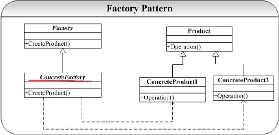 图 2 中关键中工厂模式的应用并不是只是为了封装对象的创建,而是要把对象的创建放到子类中实现:工厂中只是提供了对象创建的接口,其实现将放在工厂的子类Concrete工厂中进行。这是图 2 和图 1 的区别所在。