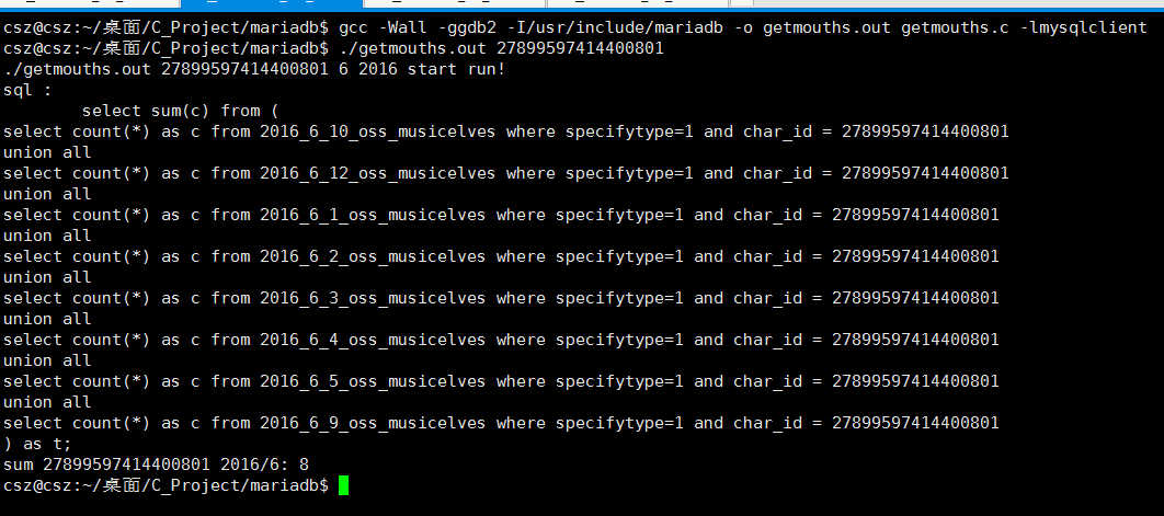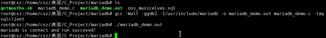su root gcc -Wall -ggdb2 -I/usr/include/mariadb -o mariadb_demo.out mariadb_demo.c -lmysqlclient ./mariadb_demo.out