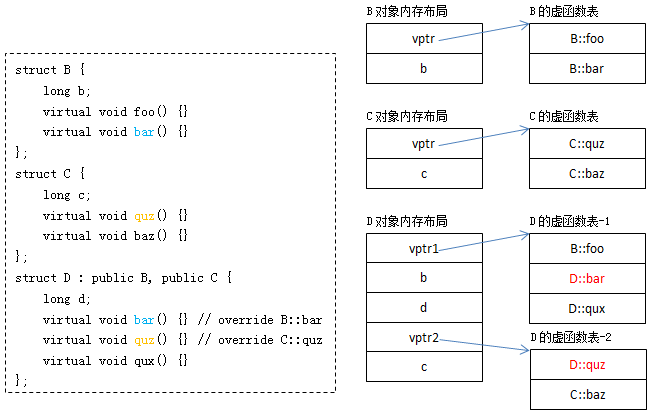 D的虚函数表中存放的既有继承自B的虚函数B::foo,又有重写(override)了基类虚函数B::bar的D::bar,还有新增的虚函数D::quz。