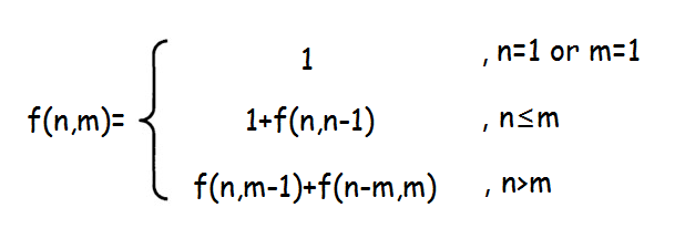 if (n>m) return f(n-m,m)+f(n,m-1);