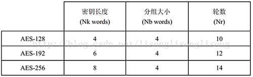 这里我们需要知道3个符号:Nb—— 状态 State 包含的列(32-bit 字)的个数,也就是说 Nb=4;Nk—— 密钥包含的 32-bit 字的个数,也就是说 Nk=4,6 或 8;Nr—— 加密的轮数,对于不同密钥长度,轮数不一样,具体如下图所示: