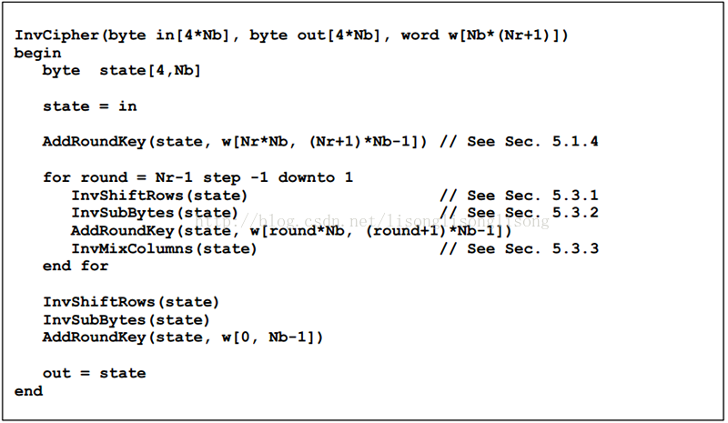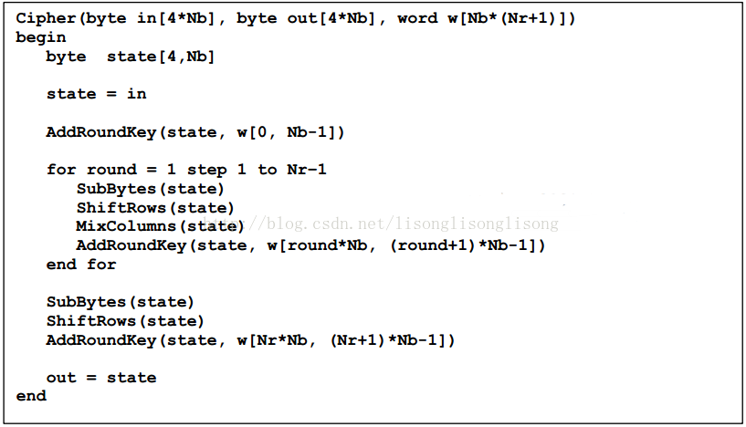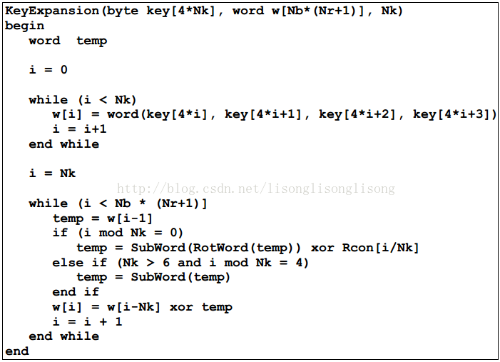 注意,上面的第四步说明适合于 AES-128 和 AES-192,详细的伪代码如下:
