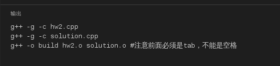 build : hw2.o solution.o g++ -o build hw2.o solution.o #注意前面必须是tab,不能是空格 hw2.o : hw2.cpp solution.h g++ -g -c hw2.cpp solution.o : solution.h solution.cpp g++ -g -c solution.cpp clean : rm hw2.o solution.o build