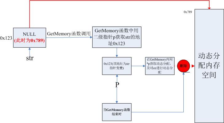 假设str本身内存为0x123 临时指针变量p的内存为0x456 动态分配的内存起始地址为0x789