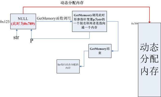 的内存地址是不相同的。所以此时str不能获取在函数GetMemmory分配的内存,因此后面的字符串复制和链接操作