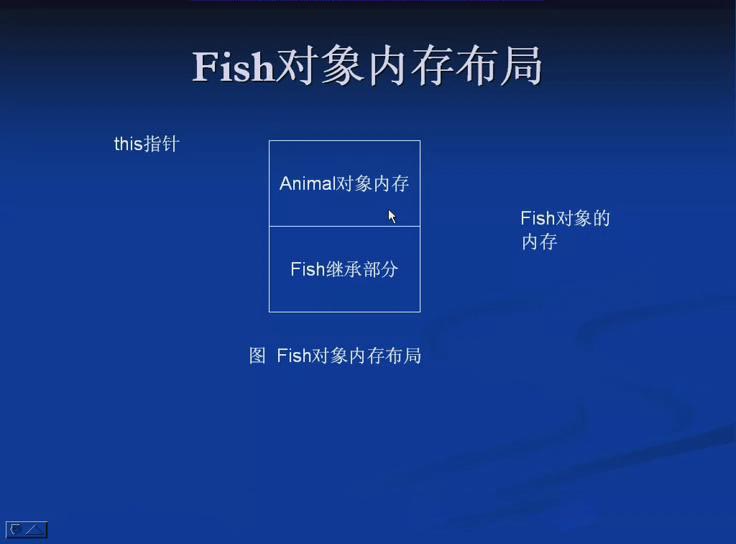 下面看看子类fish指针赋给基类animal指针时,内存的变化: 当我们构造fish类的对象时,首先要调用animal类的构造函数去构造animal类的构造函数,然后才调用fish类的构造函数完成自身部分的构造,从而拼接出一个完整的fish对象。当我们将fish类对象转换为animal类对象时,该对象就被认为是原对象整个内存模型的上半部分,也就是图中animal对象的内存部分。当我们利用类型转换后的对象指针去调用它的方法时,自然是调用它所在的内存中的方法。 在这里,animal类对象类似于char类型的对象,fish类对象类似于int类型的对象,将fish类对象赋给animal类对象时,会截取fish类对象自身的部分,剩下fish类对象中的animal部分。