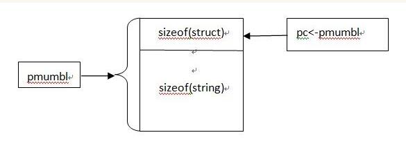 指针 pmumbl 指向的是 malloc 所分配的整个内存,而 pmumbl->pc 指向的是这块内存的第一个字节,因为 malloc 操作为整个 string 分配了足够的内存,所以在 strcpy 时,虽然溢出了 pc 的内存范围,但没有溢出 struct 的内存范围,使得 strcpy 的结果是合理的和可控的。这样一来,相当于 struct 拥有了可变大小的数组,更加灵活。