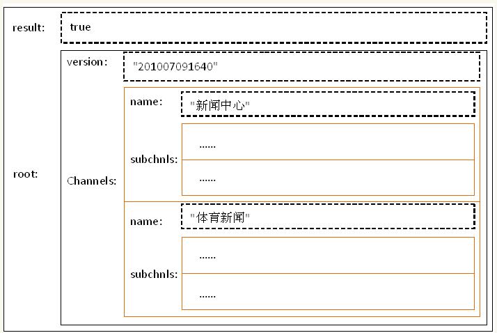 这段JSON描述了一个对象(最外层大括号包围的部分),为了方便区分,我们就将其称为对象A吧。对象A有两个Item(即key-value键值对),一个是result,其值为true;一个是root,其值为一个对象,称为对象B。对象B也有两个Item,一个是version,其值为一个字串” 201007091640”;一个是channels,其值是一个数组,而数组的成员都是一个对象,每个对象又包含两个Item,一个是name,值分别为字串"新闻中心"和"体育新闻";一个是subchnls,值都是数组,每个数组又分别有若干个成员,每个subchnls成员也都是一个对象,每个对象都有三个Item:title、link和desc。也许你看到这,已经是一头大汗了,不过没关系,我们来帖张这段JSON文本对应的结构图,有图就有真相,请看图六: