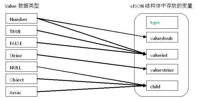 在解析JSON过程中,从JSON格式描述的value数据到CJSON对象中存放的变量的一个映射关系如图七: