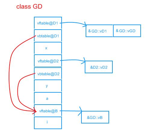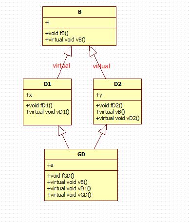 <一>类图的解释:D2覆盖了B的vB,GD覆盖了D1的vD1同时也覆盖B的vB,GD也有自己的虚函数vGD。