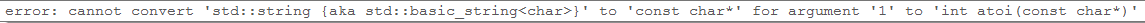 显然,atoi需要的事const char*类型,而我上面给的上string类型,所以就要 多加一个函数string.c_str()。string.c_str是Borland封装的String类中的一个函数,它返回当前字符串的首字符地址。