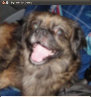 由于我们缩小了图像,我们也因此丢失了一些信息。通过连续按两次 ‘u' 向上采样两次 pyrUp ,很明显图像有些失真: