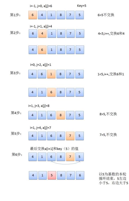 1.i逐渐增加,它一直代表着小于key=5的最后一个元素,j也在主键增加,一直到key前面一个元素停止