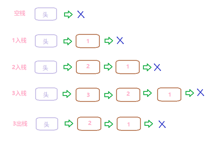 压栈(或推入、进栈)即push,将数据放入栈顶并将栈顶指针加一