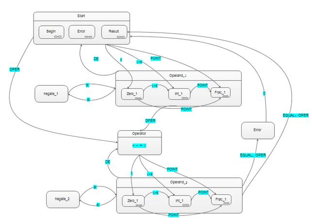 计算器可以分为七种状态:Start、Operand_1、Negate_1、Operator、Operand_2、Negate_2、Error。其中Start、Operand_1、Operand_1状态又分了几种子状态。 下面简要的介绍下状态状态转换的过程: