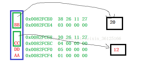 两个空格处地址相差为8,第一个空格处存放空格处位置到AA的偏移量为20,第二个空格处存放空格处位置到AA的偏移量为12,浪费两个空间存放偏移量,AA只需计算一次。