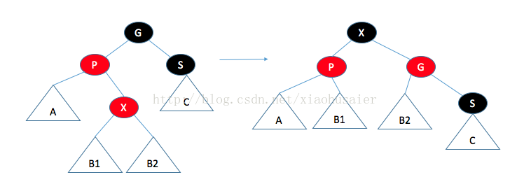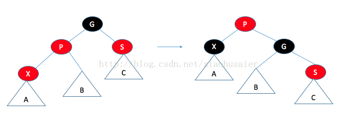 如果父节点是红色,那么有几种情形需要考虑。首先,假设这个父节点的兄弟是黑色(NULL节点约定为黑色)。这对于插入3或8是适用的,但对插入99不适用。令X是新加的树叶,P是它的父节点,S是该父节点的兄弟,G是祖父节点情况一:父节点的兄弟是黑色的。通过操作使得到达A,B,C的黑色路径保持不变(满足条件4),而且没有连续的红色节点(满足条件3).。