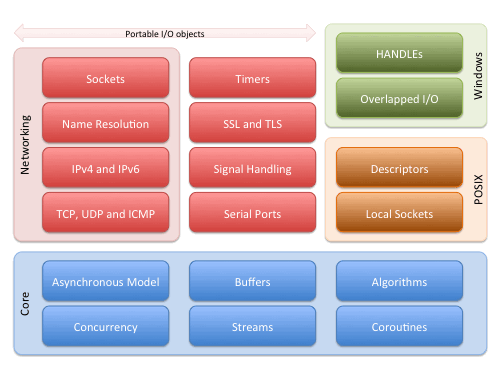 Asio 是一个跨平台的 C++ 库,常用于网络编程、底层的 I/O 编程等 (low-level I/O),其结构框架如下: